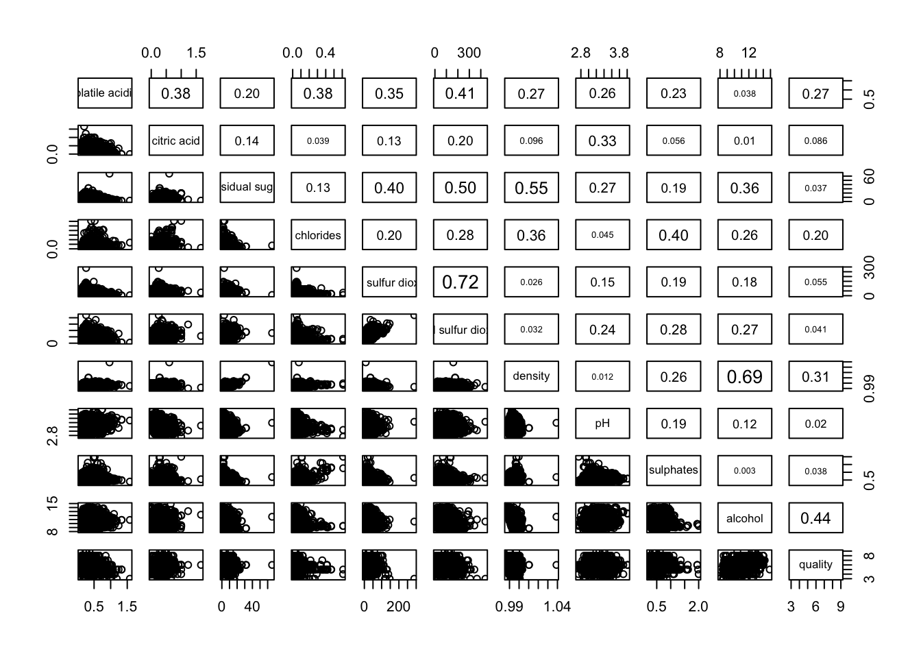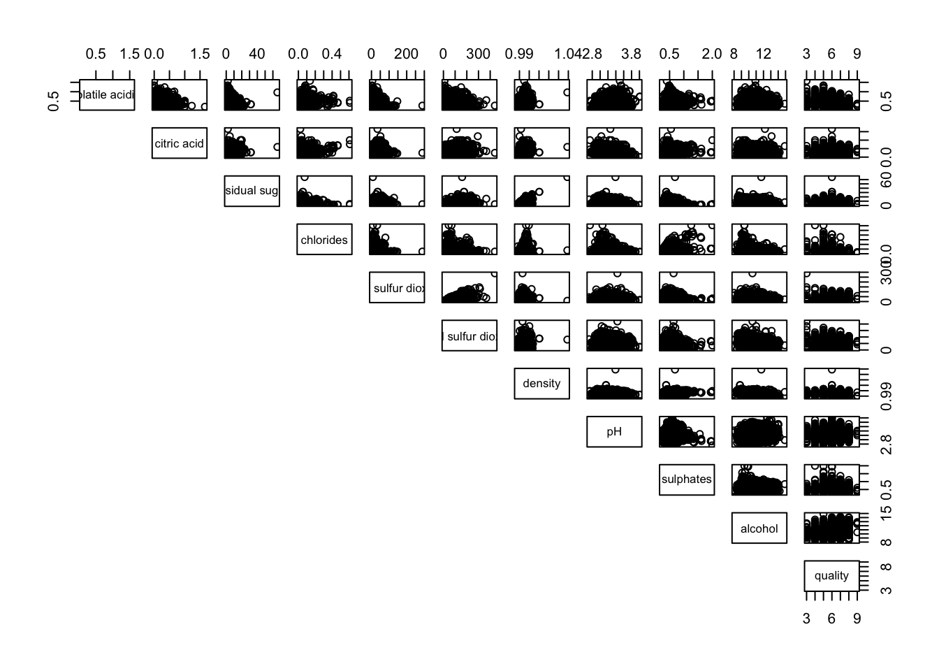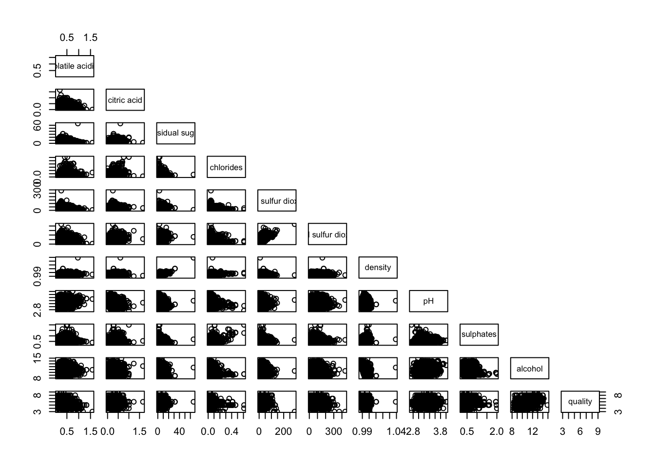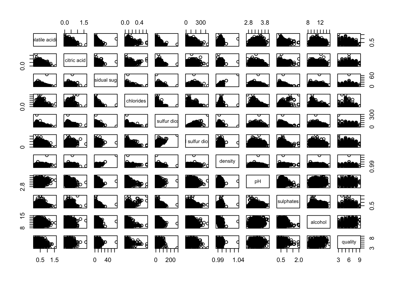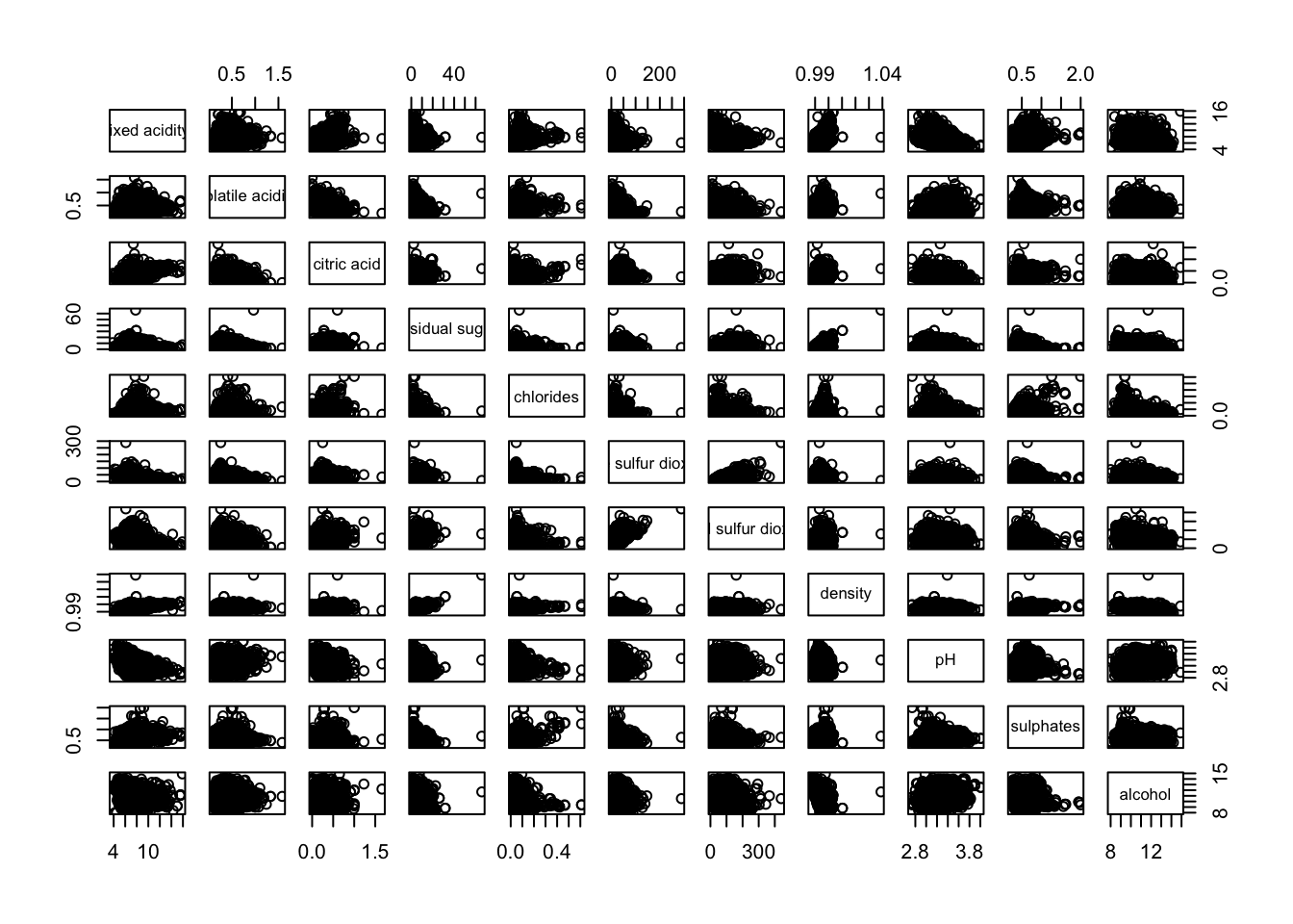 pacman::p_load(corrplot, ggstatsplot, tidyverse)wine <- read_csv("data/wine_quality.csv")pairs(wine[,1:11])