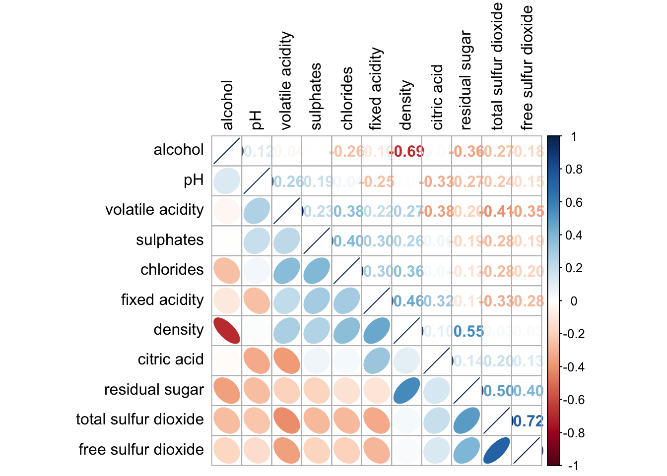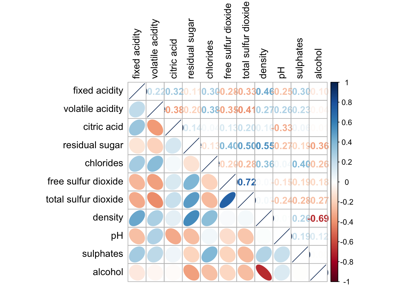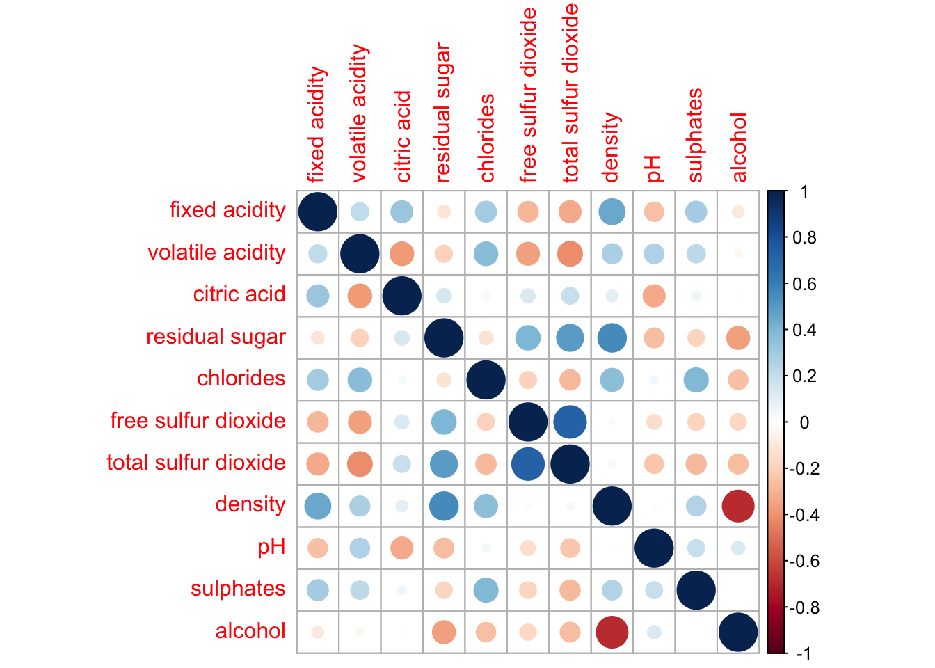 wine.cor <- cor(wine[, 1:11])corrplot(wine.cor)