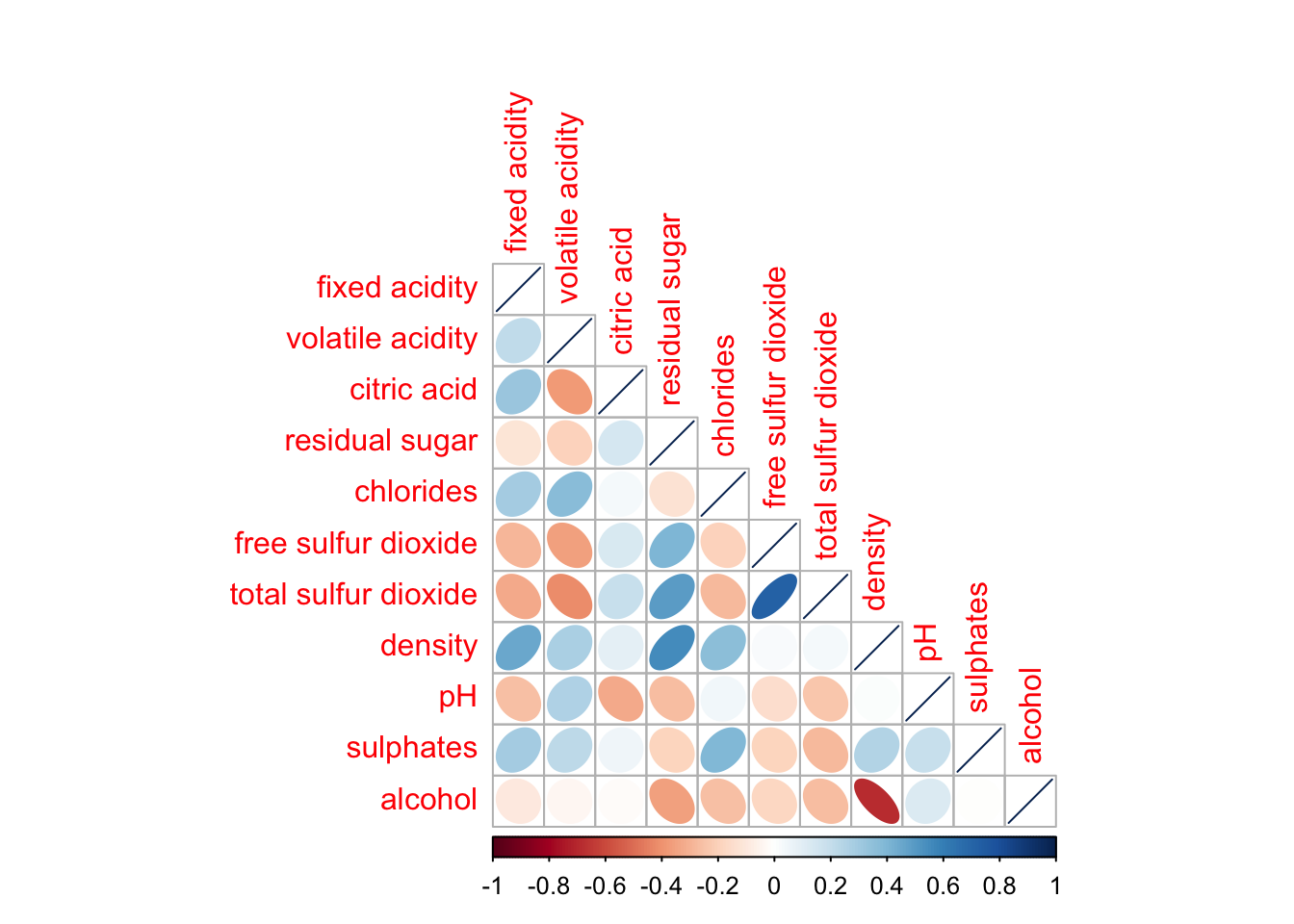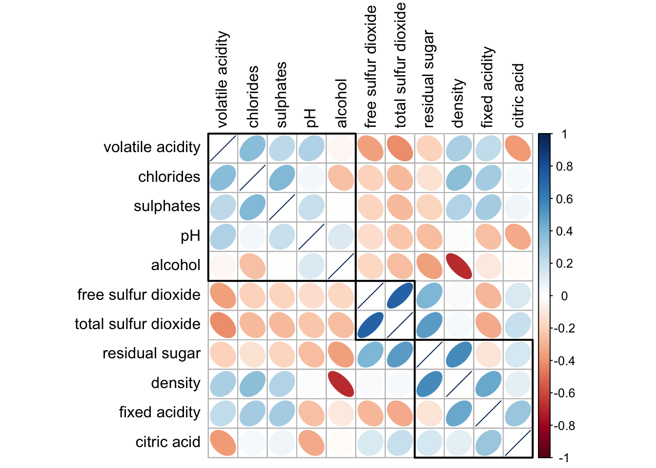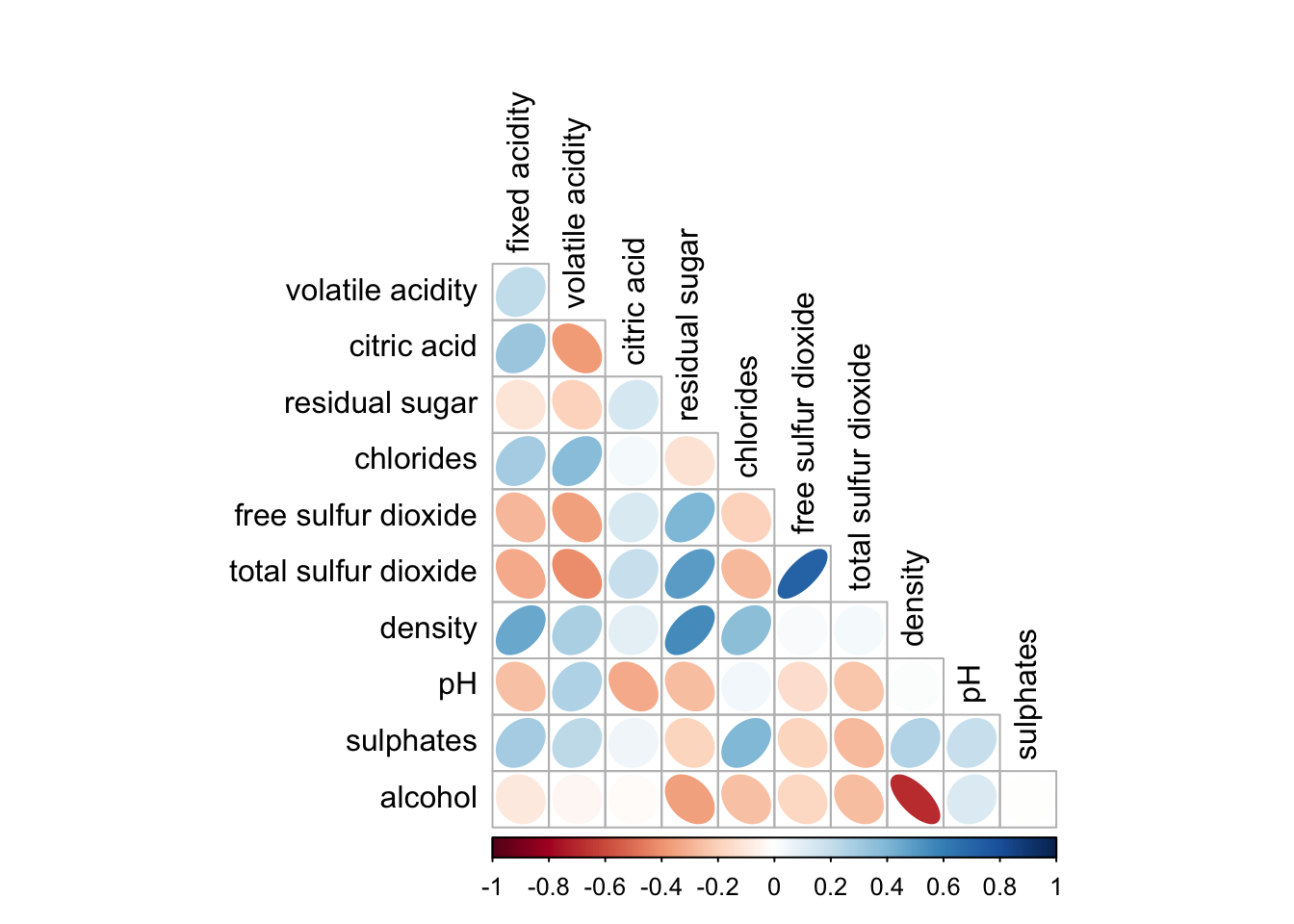 wine.cor <- cor(wine[, 1:11])corrplot(wine.cor)