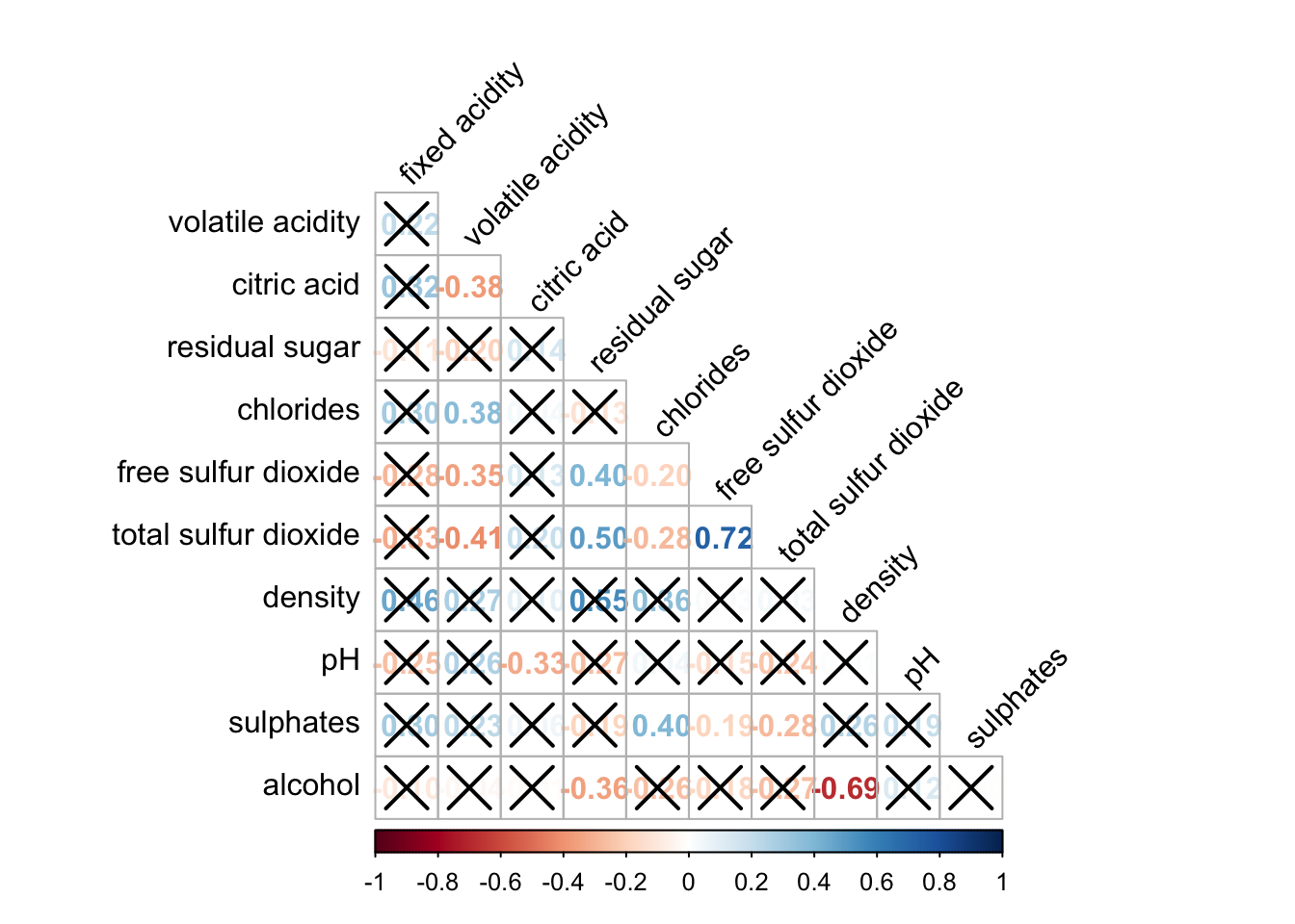 wine.sig = cor.mtest(wine.cor, conf.level= .95)corrplot(wine.cor,