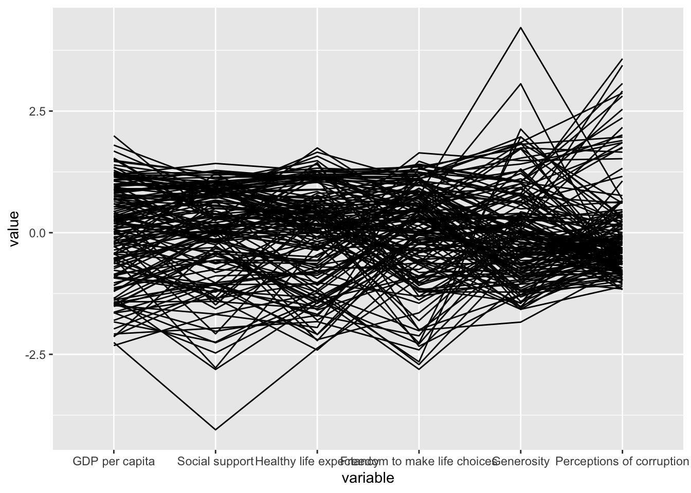 pacman::p_load(GGally, parallelPlot, tidyverse)wh <- read_csv("data/WHData-2018.csv")ggparcoord(data = wh,