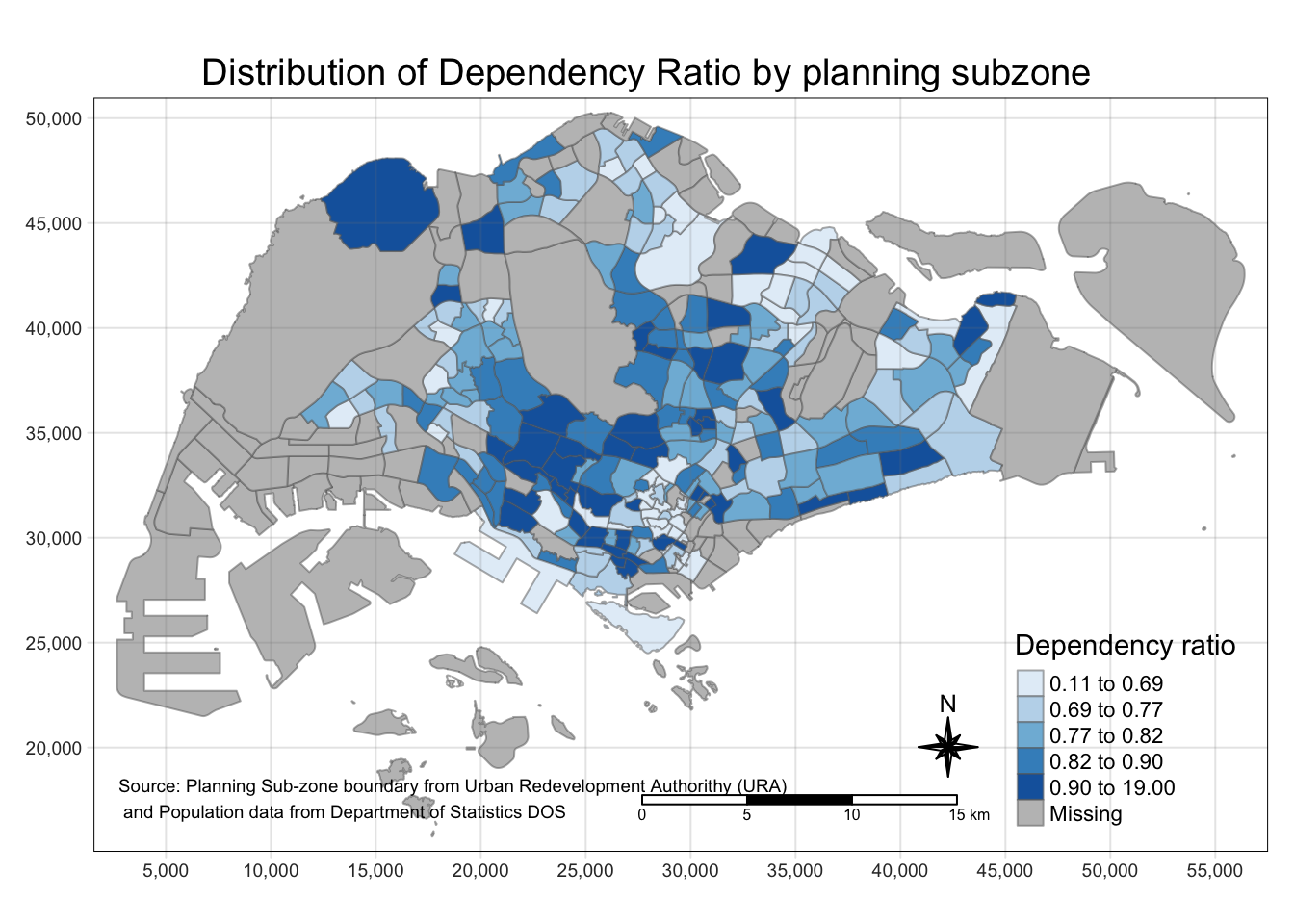 tm_layout(main.title = "Distribution of Dependency Ratio by planning subzone",