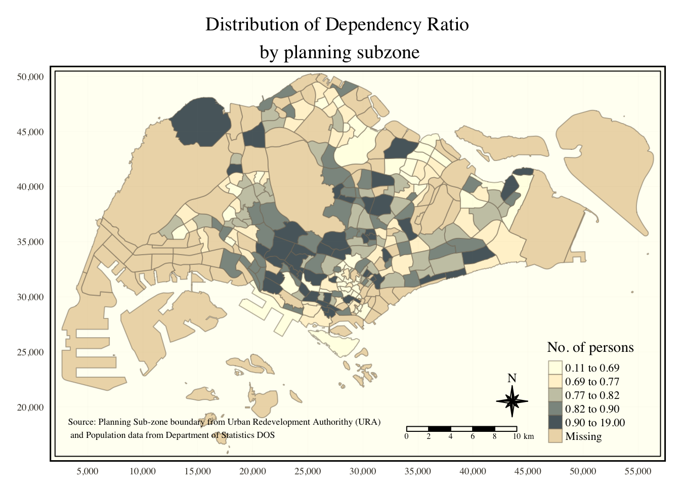 tm_credits("Source: Planning Sub-zone boundary from Urban Redevelopment Authorithy (URA)\n and Population data from Department of Statistics DOS",